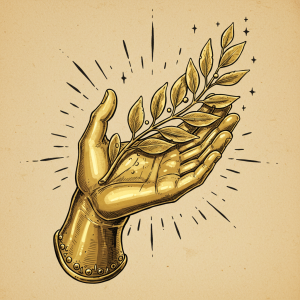 Эта золотая статуэтка размером с человеческую ладонь изображает раскрытую руку, держащую лавровую ветвь. Она излучает слабое золотистое сияние и теплая на ощупь.